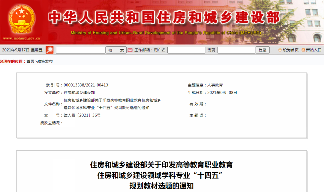 近日,住房和城乡建设部发布了《住房和城乡建设部关于印发高等教育职业教育住房和城乡建设领域学科专业“十四五”规划教材选题的通知》,经过单位申报、专家评审,确定了512项住房和城乡建设领域学科专业 “十四五”规划教材选题。万博官网共有2个项目入选。