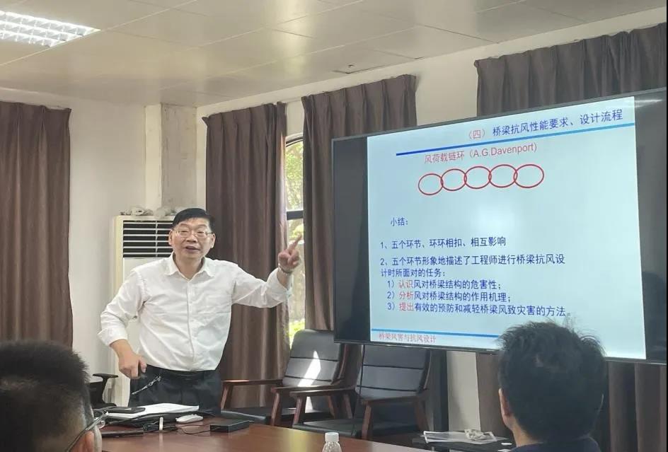 李龙安副院长从桥梁风害出发,结合国内外桥梁风害的实例概括出风对桥梁影响的三过程,具体分析了多个实例振动成因。通过对桥址处的风环境、风参数的分析,综合我国历史上较为严重的气象灾害与各地区风的特性,他介绍了大跨度桥梁抗风设计的标准,并对风荷载各项参数的确定及风荷载等效进行了详细的讲解,分析了大跨度桥梁颤振、驰振、涡激振动和抖振的致振机理,明确了桥梁抗风的设计流程。李龙安教授还从桥梁抗振动出发,分析了深圳赛格大厦振动事件的原因,也为大家介绍了相应的解决方法。