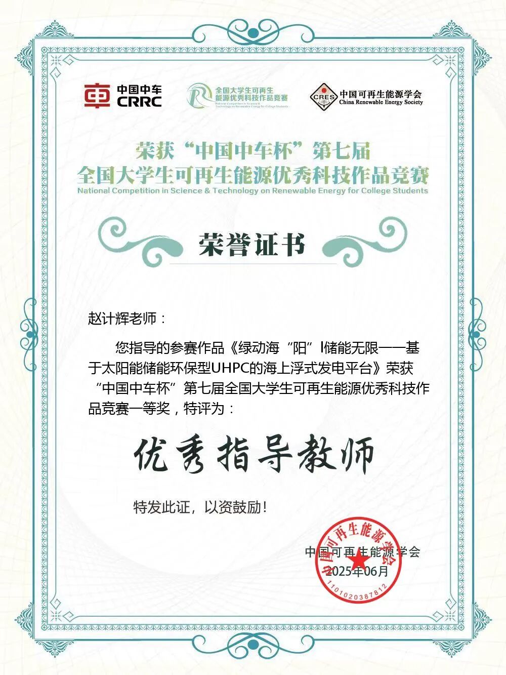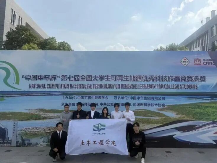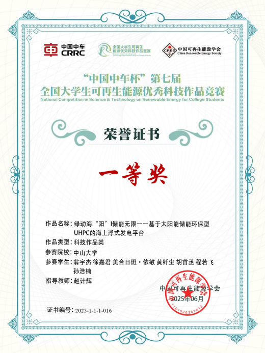 近日,由中国可再生能源学会主办的“中国中车杯”第七届全国大学生可再生能源优秀科技作品竞赛决赛在江苏省盐城市举行。本次竞赛共有来自全国305所高校的2013项作品参赛。万博官网2个本科生团队获得一等奖1项、三等奖1项,3个研究生团队获得三等奖3项。其中,本科生团队参赛项目《绿动海“阳”|储能无限——基于太阳能储能环保型UHPC的海上浮式发电平台》(参赛学生:翁宇杰、徐嘉君、美合日班·依敏、黄纤尘、胡首丞、程若飞、孙浩楠,指导教师:赵计辉)从众多作品中脱颖而出,荣获一等奖。