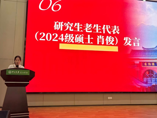 研究生老生代表、2024级土木水利专业肖俊同学在发言中分享了自己的求学感悟。作为学院研究生会主席团成员,她从科研和实践两个维度鼓励新生:以好奇与诚实为底色开展科研,培养自我驱动力并在与问题打交道中成长进步;秉承"水土交融、知行合一"的学院文化理念躬身实践。还分享了学院组织开展的“暑假三下乡”、“返家乡”、行业实习和各类志愿活动。